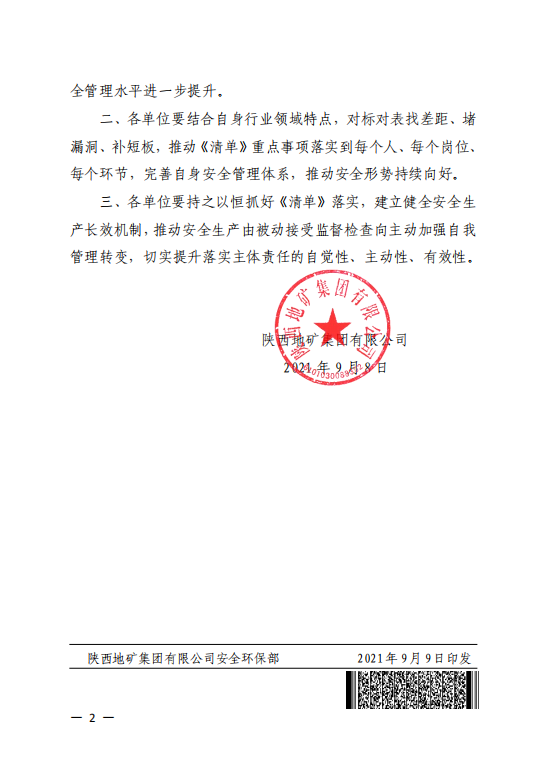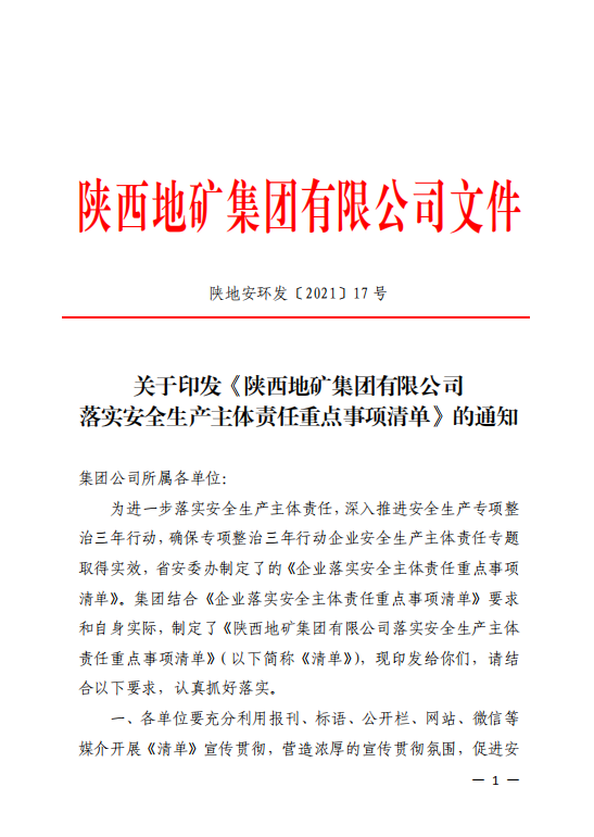 关于印发《陕西地矿集团有限公司落实安全生产主体责任重点事项清单》的通知